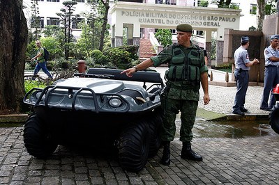 São Paulo – Foi apresentado nesta terça-feira (19), pela Polícia Militar, um veículo capaz de se locomover na terra ou na água. Ele será testado por 15 dias e se aprovado, será importado do Canadá pelo Governo de São Paulo a um custo de R$ 130 mil duas unidades (modelo 6×6 custa R$ 60 mil, e o 8×8, R$ 70 mil).