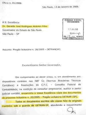 Em reportagem publicada nesta sexta-feira, 22, o estadão.com.br informou que Alckmin teria recebido informações apontando a manipulação de um pregão do Detran de 2006 que deu a empresa Cordeiro Lopes o controle dos serviços de emplacamento de carros no interior do Estado de São Paulo.