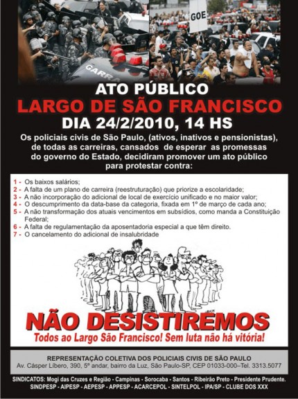 O rol de casos de corrupção na polícia tem aumentado assustadoramente e parece que só não preocupa o Governador e seu secretário de Segurança Pública. A população está muito preocupada com a escalada do crime na polícia paulista e espera não só a célere e rigorosa apuração de todos os crimes denunciados, mas também imediatas providências destinadas a evitá-los.