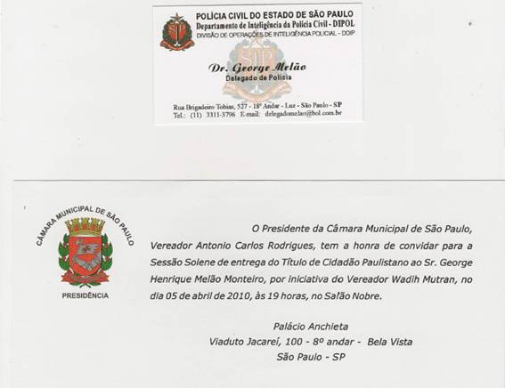 É com grande honra que os convido para que compareçam a cerimônia que ocorrerá no dia 05 de abril de 2010 as 19:00 hs, ocasião em que o nosso colega MELÃO receberá no salão nobre da Câmara Municipal o título de CIDADÃO PAULISTANO.