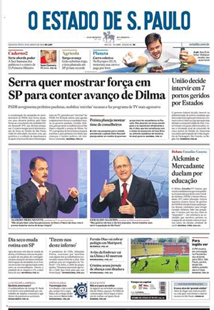 Foi fechada ontem uma agenda conjunta entre Serra e o candidato tucano ao governo de São Paulo, Geraldo Alckmin, com o objetivo de projetar a candidatura presidencial no Estado. Tucanos querem fazer uma frente no maior colégio eleitoral do País, impedindo o avanço de Dilma.