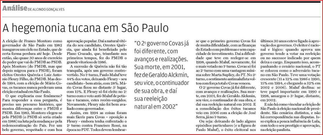 PROFESSOR ALCINDO GONÇALVES: “A HEGEMONIA TUCANA EM SÃO PAULO” 1