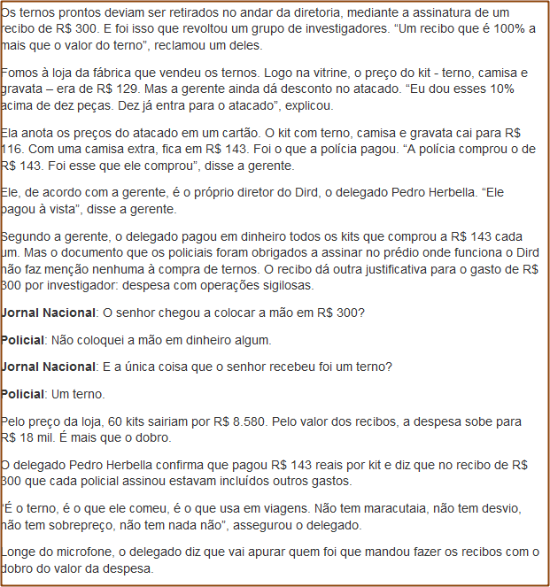 Um delegado foi o primeiro a investigar o desaparecimento. Sem saber que a conversa era gravada, tentou se explicar: “A nossa viatura não tinha condições de deslocamento, porque a gente tem uma viatura aqui que só transita dentro da cidade porque ela não tem condições de viagem”.