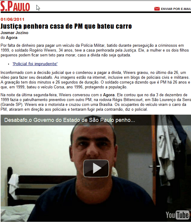 É o que está acontecendo com o soldado Rogério Weiers. Ele corre o risco de perder o terreno onde mora com a mulher e dois filhos, em Embu (São Paulo). Isso porque, em 1999, durante uma patrulha, trocou tiros e perseguiu um veículo suspeito na contramão da rodovia Régis Bittencourt.