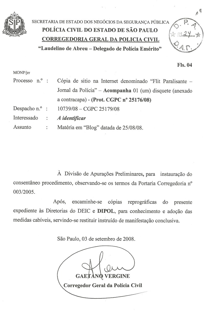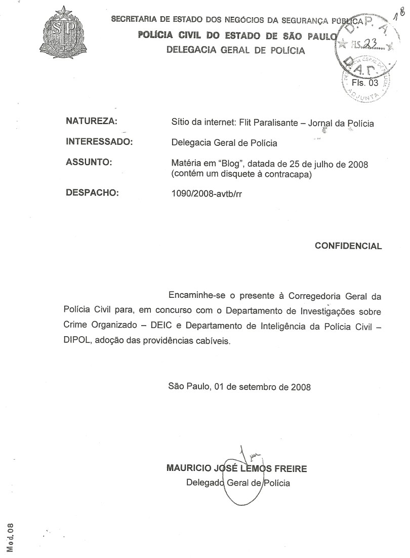 Em seguida, instaurado IP no DEIC – AUTORIA DESCONHECIDA – a sábia autoridade faz um libelo acerca da utilização do anonimato para disseminação de crimes contra a honra de autoridades, atentados contra o bom funcionamento dos serviços policiais, fomentação da discórdia e, ainda, tendo por vítimas autoridades e políticos como JOSÉ SERRA e outros.