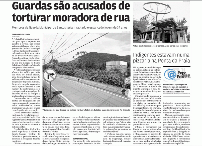 A jovem, natural de Poços de Caldas, relatou na Delegacia de Cubatão que dormia na desativada Pizzaria Cristal, situada na esquina da Avenida Epitácio Pessoa com a Rua Coronel Pedro Arbues, na madrugada do último sábado, quando lá encostou a Kombi da Guarda Municipal e, dela, desembarcaram cinco integrantes da corporação.