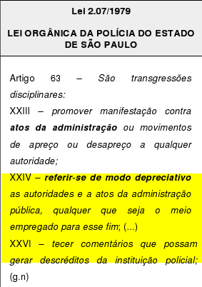Sobre a proibição estatutária de 1979 de tecer comentários depreciativos e a referir-se a autoridades e atos que possam gerar descrédito é possível verficar que tal proibição é passível de ação direta de inconstitucionalidade por afrontar a Constituição Federal, lei maior de 1988 no principio fundamental da livre espressão de pensamento e de informação, a todo e qualquer cidadão sem distinção, seja funcionário publico ou não.