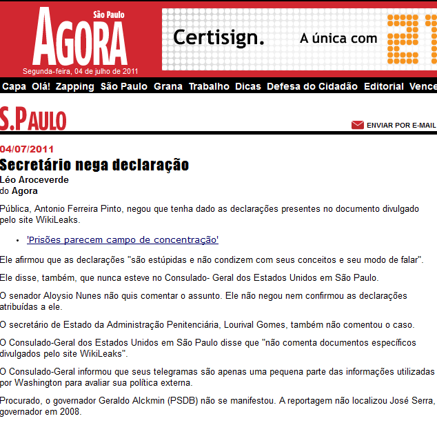 Também por meio de sua assessoria, Aloysio Nunes Ferreira comunicou que tampouco iria se pronunciar. “Conversei com o senador e ele disse que não vai comentar os assuntos relacionados ao WikiLeaks”, explicou Cláudia Lacerda, funcionária do gabinete.
