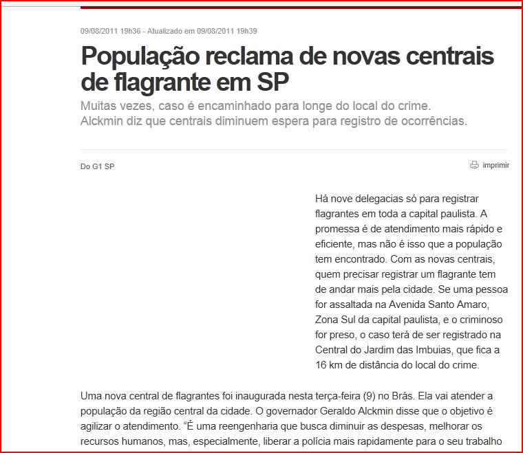 Alckmin destacou o esforço por um melhor atendimento às pessoas nos distritos policiais da Capital, com elaboração mais rápida de boletins de ocorrência, registros que em média serão feitos em 25 minutos: “Ou seja, eficiência, serviço público de qualidade, diminuição do trânsito de veículos da polícia, o preso vai da central de flagrante direto para o CDP (Centro de Detenção Provisória), para a SAP (Secretaria de Administração Penitenciária), e diminuição do trânsito de presos”.