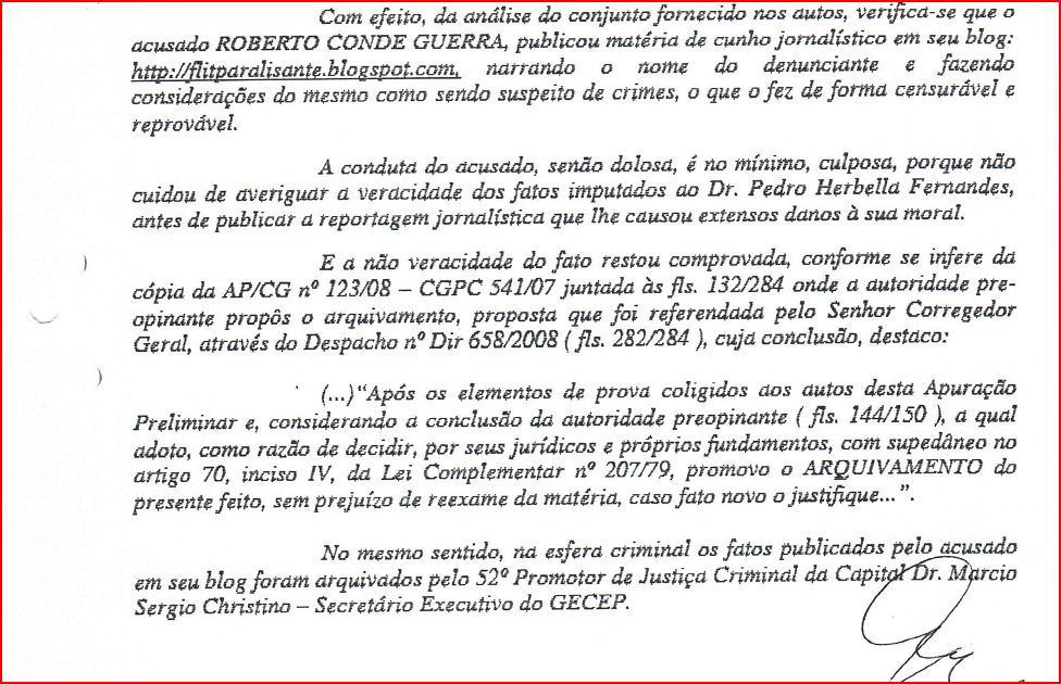 Q-SUCO! …OS FATOS PUBLICADOS PELO ACUSADO EM SEU BLOG FORAM ARQUIVADOS PELO 52º PROMOTOR DE JUSTIÇA CRIMINAL DA CAPITAL Dr. MARCIO SERGIO CHRISTINO – SECRETÁRIO EXECUTIVO DO GECEP ( “sic” afirmou Rosemary Sinibaldi) 12