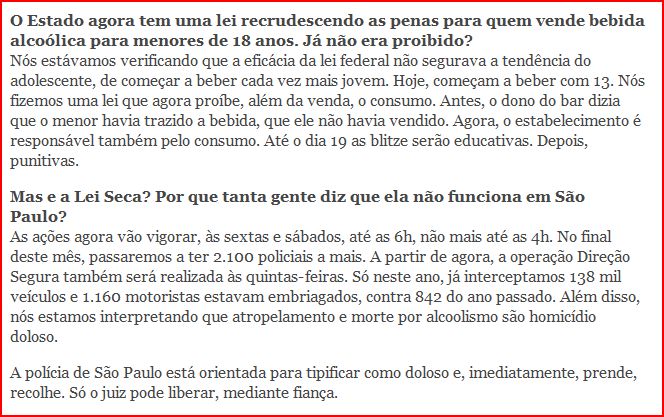 Chamem o Figueiredo, o Golbery e o Erasmo Dias, pois não estou acreditando na entrevista que acabo de ler no Estadão on line, atribuida ao Governador Alckmin, em que ele teria afirmado que “nós estamos interpretando que atropelamento e morte por alcoolismo são homicídio doloso” e ainda acrescentado que “a polícia de São Paulo está orientada para tipificar como doloso e, imediatamente, prende, recolhe. Só o juiz pode liberar, mediante fiança!”