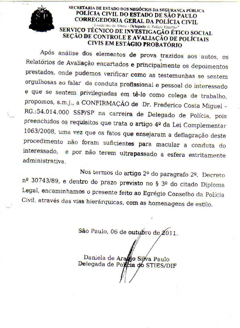 Sr. Governador, pelo que consta dos autos do Processo 24/DIF/11 – DGP 07800/11, que apurou as condutas do Delegado de Polícia Dr. Frederico Costa Miguel em três casos distintos e de acordo com as avaliações semestrais prestadas por TODOS os seus superiores hierárquicos e juntadas aos autos as folhas 40, 68, 339 e 341, foram unanimes em afirmar que ele era um funcionário exemplar, cumpridor de suas obrigações, disciplinado, respeitador, dedicado, responsável, assíduo, prestativo, etc. e concluíram pelo seu aproveitamento e aprovação, o que fundamentou um relatório da Corregedoria (Órgão Técnico responsável pela investigação) totalmente favorável a sua CONFIRMAÇÃO no cargo, conforme se verifica na última página do relatório acima exposta.