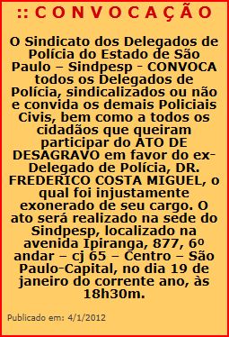 O Ato de Desagravo em favor do ex-Delegado de Polícia, Dr. Frederico Costa Miguel, injustamente exonerado, e que será promovido pelo Sindicato dos Delegados de Polícia do Estado de São Paulo – Sindpesp, no dia 19 de janeiro às 18h30m em sua sede, já é de conhecimento nacional. Confirmaram presença os Sindicatos de Delegados do Rio de Janeiro, Espirito Santo, Minas Gerais e Goiás, bem como a Associação dos Delegados de Polícia do Brasil – Adepol-BR.