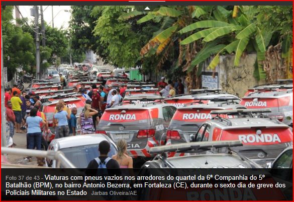 Em greve desde o último dia 29, os policiais cearenses reivindicam uma escala de 40 horas semanais, 80% de reajuste salarial pelo menos até 2014, a realização de promoções na categoria e a anistia dos militares que participaram de uma manifestação contra o governo. Por conta da paralisação, a segurança no Estado está sendo feita por um efetivo de mais de 2.500 militares do Exército, Força Nacional de Segurança e PMs de grupamentos especiais como Cotam e Batalhão de Choque.
