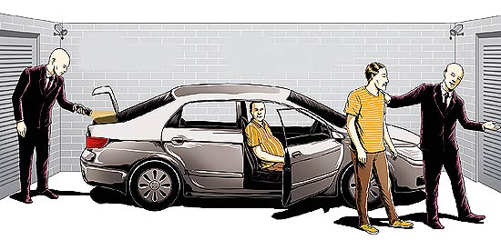 Em seguida, o funcionário vistoria o carro, em busca de algum estranho.