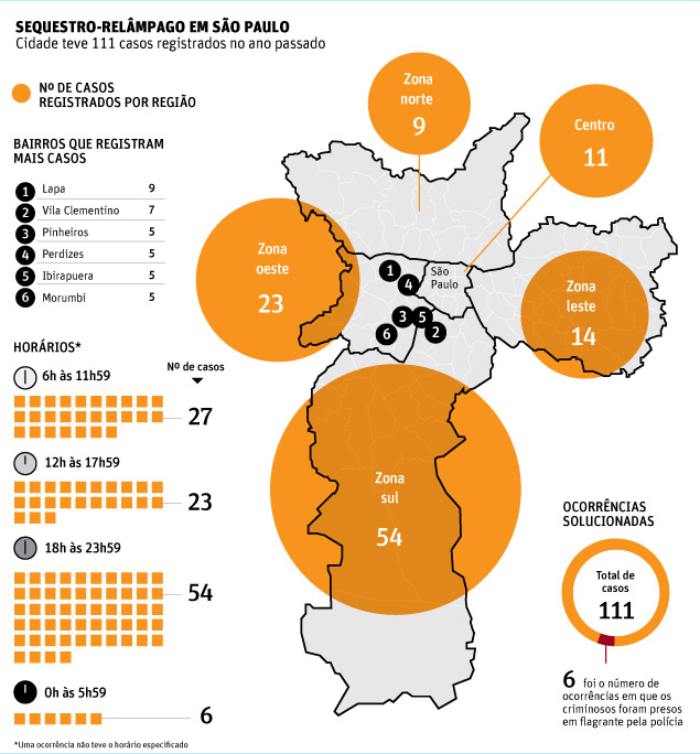 O levantamento realizado pela Folha no Infocrim, a base de dados sobre a violência do governo paulista, revelou também que a madrugada não é, ao contrário do que pode se imaginar, quando mais ocorre sequestro-relâmpago na capital paulista.