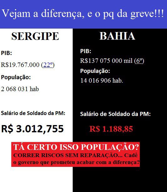 divulguem o que e certo o pm bahiano ganha R$.1.900,00 por mes e folga tres dias apos o serviço. ou seja para realidade da cidade esta bom demais. ja que vc quando precisa não e atendido. basta chegar no estacionamento do extra paralela apos as 12;00 hs noite que vc encontrara duas ou tres viaturas estacionada com policias cochilando dentro.