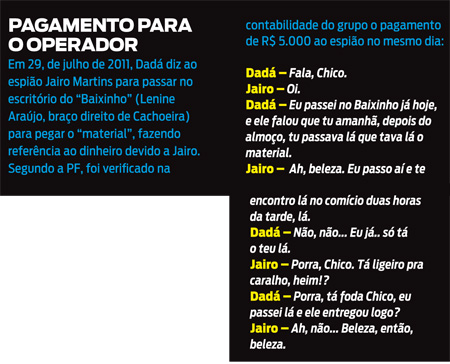 Pelo que se depreende da análise de diálogos e relatórios ainda inéditos da Operação Monte Carlo, obtidos por ISTOÉ, Dadá não mudou apenas seu estilo de vida. O ex-espião da FAB assumiu o papel de operador de Carlinhos Cachoeira e da empreiteira Delta. No governo de Goiás, coube a ele a indicação para diversos cargos do segundo escalão. Mais recentemente, ensaiava passos como empresário e sindicalista. Segundo a PF, Dadá é sócio oculto da Agência Plá junto a Marcelo Lopes, o Marcelão, ex-assessor da Casa Militar do Distrito Federal, e Cláudio Monteiro, ex-chefe de gabinete do governador Agnelo Queiroz. Além de expandir os negócios da Plá para Mato Grosso e Rio de Janeiro, Dadá, Marcelão e Monteiro teriam um projeto político independente de Cachoeira, mas que se beneficiaria dos contratos da Delta na área de limpeza urbana. Por isso, Dadá fundou em abril de 2011 a Associação Comunitária dos Trabalhadores em Limpeza Urbana do DF e Entorno. A ideia era evitar pressões sindicais contra a Delta e também mobilizar a massa de trabalhadores para eleger Monteiro deputado distrital, pelo PT.