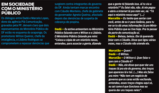 Para manter em funcionamento um esquema que é capaz de gravar conversas telefônicas, eletrônicas ou pessoais, que acessa dados sigilosos da Receita Federal e dos mais variados órgãos de inteligência do governo federal e dos governos estaduais, Dadá tem a sua disposição uma equipe de colaboradores infiltrados em diversos órgãos. São agentes públicos que criminosamente vazam ao araponga informações sigilosas sobre pessoas e empresas e que também recebem de Dadá colaboração clandestina para investigações em curso. Um dos principais operadores do espião, segundo a PF, é o chefe do setor de Inteligência do Ministério Público do Distrito Federal, Wilton Queiroz. Gravações obtidas por ISTOÉ (leia quadro abaixo) mostram que Queiroz repassa ao espião dados confidenciais sobre inquéritos e processos que tramitam pelo MP. Com essas informações, Dadá pode prevenir seus clientes sobre futuras ações da Justiça. Em troca, o espião faz grampos clandestinos solicitados pelo promotor. Se as conversas interceptadas interessarem ao Ministério Público, posteriormente é obtida uma autorização judicial para a realização de gravações oficiais. Caso não interessem, o próprio Dadá tenta repassá-las a outros clientes. A PF já sabe que, além de Queiroz, há um outro promotor de Brasília que atua em parceria com o araponga: Libânio Alves Rodrigues, também mencionado nas gravações obtidas por ISTOÉ.