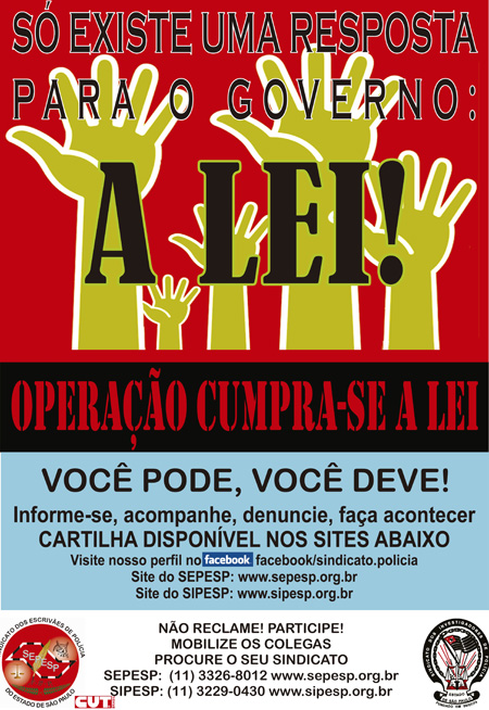 As diretorias do SEPESP e SIPESP lançaram na terça, dia 26, a cartilha da operação “CUMPRA-SE A LEI ” (baixe aqui a cartilha), que tem a finalidade de orientar os Escrivães e Investigadores a exercerem suas atividades no estrito cumprimento da lei, sobretudo ao estabelecido no Código de Processo Penal. A cartilha fornece as diretrizes para que o servidor execute suas funções de acordo com a legislação vigente. “Essa medida busca coibir os abusos cometidos contra os policiais civis, que constantemente são obrigados a exercerem funções alheias às suas, fato notório em todos as unidades policiais do Estado de São Paulo”, destaca nota das entidades. O SEPESP e o SIPESP ressaltam que o governo Alckmin se recusa a atender as reivindicações das categorias e a cumprir a lei. “Em resposta, devemos agir de forma ética e profissional, isto é, trabalhando rigorosamente dentro dos parâmetros legais. Temos conhecimento que haverá retaliação por parte do governo e de muitas autoridades coniventes com a degradação da Polícia Civil”, frisa.