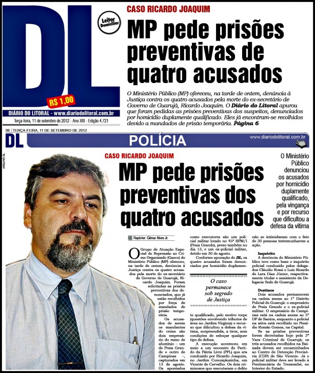 Os delegados Cláudio Rossi e Luiz Ricardo de Lara Dias Júnior, respectivamente, titular e assistente da Delegacia de Guarujá, concluíram o inquérito policial sobre a execução do ex-secretário executivo de Coordenação Governamental daquele município, Ricardo Augusto Joaquim de Oliveira, de 47 anos, e requereram a prisão preventiva das quatro pessoas que apontam como envolvidas no crime.