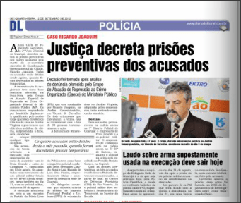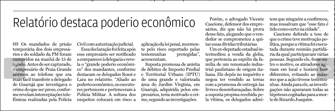 Com 14 páginas, o relatório final da investigação da Polícia Civil aponta dois empresários do ramo de alumínio (um de Praia Grande e outro de Campinas), um soldado lotado no 45º BPM/I (Praia Grande) e um ex-policial do 3º BPM/M (Água Funda – Zona Sul de São Paulo) como envolvidos no assassinato de Ricardo Joaquim, morto com três tiros, e na tentativa de homicídio contra outro homem, baleado no pé.
