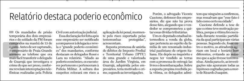 Posteriormente, o outro foi transferido para o batalhão de Praia Grande. Rossi e Lara entendem que os dois acusados da execução e os dois empresários apontados como mandantes cometeram dois homicídios –um consumado e outro tentado — qualificados pelo motivo torpe e pelo recurso queimpossibilitou a defesa das vítimas. O inquérito agora será analisado pelo Ministério Público, a quem cabe denunciar ou não os indiciados, bem como requisitar eventualmente novas diligências.