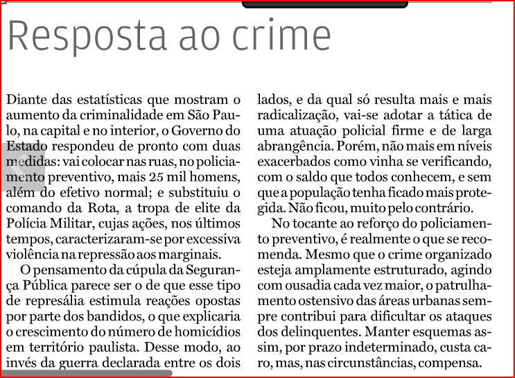 É por essa razão, segundo ele, que a facção criminosa elegeu como alvo prioritário a Rota. Para Ferreira Pinto, as prisões de traficantes feitas pela tropa da PM minam as finanças do PCC. Vem daí as mortes de policiais aparentemente ordenadas pela facção.