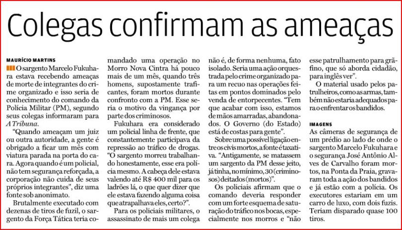 É simplesmente estarrecedor e nem em meus piores pesadelos poderia conceber as cenas mostradas pela televisão da execução canalha, covarde contra um sargento da PM no litoral. Até quando isso irá continuar?? Acredito que enquanto Geraldinho for Governador e Ferreira Pinto Secretário. O cinismo desses dois senhores, bem como de oficiais superiores da Policia Militar que diga-se de passagem não vão para a linha de frente e usam carros descaracterizados e roupa a paisano, continuarem a negar a existência de uma Guerra Civil, de Policia contra bandidos, ou seja, do bem contra o mal e nós no meio dessa carnificina.