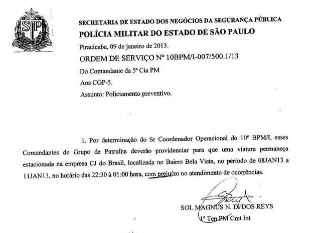 Uma denúncia anônima enviada à Associação das Praças Policiais Militares da Ativa e Reformados do Estado de São Paulo (APPMARESP), sobre supostos crimes de favorecimento pessoal e “venda de policiamento” em Piracicaba (SP), foi encaminhada pela entidade à Corregedoria da PM. De acordo com a denúncia, a coordenação operacional do 10º Batalhão de Polícia Militar do Interior, sediado na cidade, determinou que comandantes do Grupo de Patrulha tinham de mandar uma viatura da PM permanecer estacionada na empresa CJ do Brasil, no bairro Itaperu, entre os dias 8 e 11 de janeiro, das 22h30 à 1h. saiba mais Comandante da PM em Piracicaba e região é afastado pela Corregedoria Coronel afastado do comando da PM de Piracicaba anuncia aposentadoria Denúncias contra policiais crescem 23% no interior de SP, diz ouvidoria A associação divulgou em sua página na internet imagens de uma ordem de serviço interna, que, se comprovada a autenticidade, pode provar as irregularidades apontadas (veja foto abaixo). Segundo a entidade, a denúncia foi encaminhada à Corregedoria da PM para que o caso seja investigado. “Decidimos tornar o documento público após votação em assembleia. Ainda não sabemos do resultado das investigações, mas a entidade aguarda os procedimentos da Corregedoria”, afirmou Marco Ferreira, membro do conselho deliberativo da associação de policiais militares. Resposta da CJ Em nota, a administração da CJ informou que solicitou à PM o patrulhamento das vias públicas de acesso à empresa depois que colaboradores relataram uma tentativa de assalto no local. “Nossa empresa fica na Estrada Professor Messias José Baptista, uma área onde não há fluxo regular de veículos e, por isso, os assaltantes visualizaram uma oportunidade para cometer crimes.