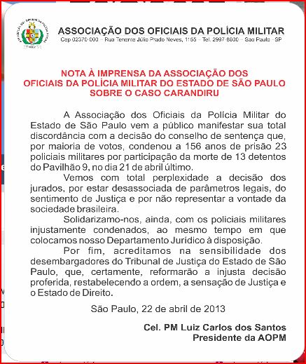 A Polícia Militar inconformada e afrontada pela condenação do Carandiru ensaia uma “quartelada” contra a soberania do Tribunal do Júri, por eles chamado de “vala comum”… Ora, “vala comum” é o tribunal instituído pela PM para aplicar “nas quebradas” deste Estado o seu próprio Código Penal não escrito…Basta, o Brasil mudou!…Lugar de político corrupto e militar assassino é a cadeia!…Desembargador não pode ter rabo preso com seus seguranças! 130