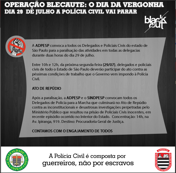 O movimento, segundo a Adpesp, é de protesto contra as péssimas condições de trabalho e também em repúdio contra ‘a arbitrariedade e escracho ao qual a categoria foi submetida com o episódio da prisão dos delegados do Departamento Estadual de Repressão ao Narcotráfico (Denarc)’. O segundo ato será uma marcha, que sairá às 14h da Galeria do Conjunto Cinerama, na Avenida Ipiranga, no centro da capital, com destino à sede da Procuradoria-Geral de Justiça, na Rua Riachuelo, também no centro da capital, onde acontecerá o ato de repúdio.