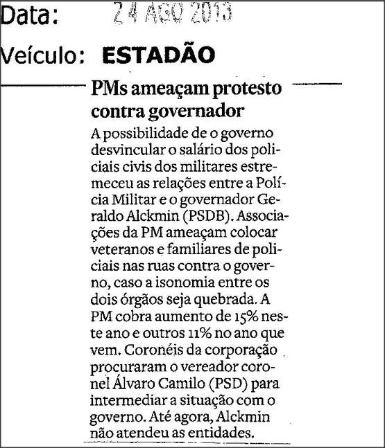 Notícia publicada na edição de 24/08/13 do Jornal Cruzeiro do Sul, na página 3 do caderno A – o conteúdo da edição impressa na internet é atualizado diariamente após as 12h.
