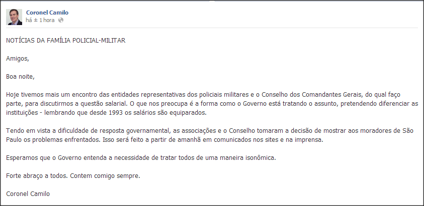 Obrigado Polícia Civil por mostrar o quanto somos fortes e unidos. Obrigado por acreditar que ganhariam aumento diferenciado maior que o nosso. Contentem-se em ser aqueles que colocam no papel o nosso trabalho incansável nas ruas de São Paulo, sem a Rota e sem o nosso P2, o crime já teria dominado o nosso querido estado. Obrigado governador de São Paulo por prestigiar aqueles que, humildemente, estão do lado de vossa excelência nos momentos mais difíceis de vossa gestão. Esperamos que não levem a mal nosso posicionamento, afinal em tempos de guerra todo procedimento para defender nossa bandeira é válido. Não podemos fazer greve, mas temos nossos meios de atingir nossos objetivos. Novamente o nosso obrigado. Àqueles que nos difamaram e desejaram o nosso mal, continuaremos a dar o nosso apoio quando solicitados via 190, afinal fazemos o nosso trabalho sempre com dignidade e respeito a quem for. Forte abraço.
