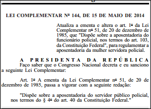 A mulher policial poderá agora se aposentar após 25 anos de contribuição, desde que conte pelo menos com 15 anos de exercício em cargo de natureza estritamente policial. Atualmente, o tempo de serviço exigido é o mesmo para homens e mulheres da categoria – 30 anos, com ao menos 20 anos no serviço estritamente policial.