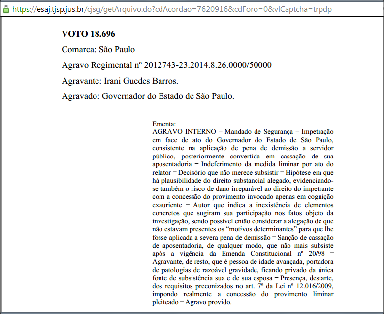 O Tribunal de Justiça de São Paulo – acolhendo argumentos da advogada Anna Andrea Smagasz – anula a cassação da aposentadoria do delegado Irani Guedes Barros 25