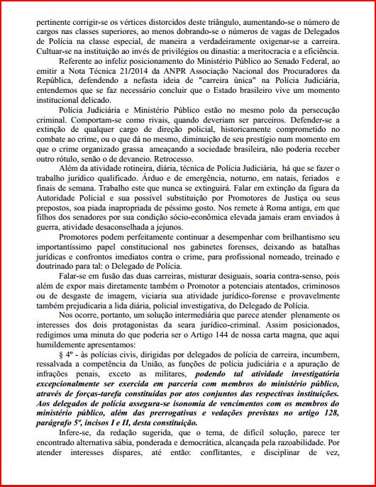 Que o bom senso impere, em desfavor da criminalidade, nosso único e real inimigo. E que entre o Ministério Público e a Polícia Judiciária, instituições indispensáveis ao bom funcionamento da justiça, seja gradativamente construído um clima de paz, harmonia jurídica e necessária boa convivência profissional. Em prol da sociedade brasileira, razão evidente, maior, da existência do serviço público.
