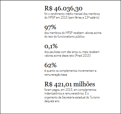 O Ministério Público de São Paulo afirmou em nota que nenhum membro recebe vencimentos acima do teto constitucional. O texto informa que pagamentos indenizatórios reembolsam despesas de promotores no cumprimento da função e, por isso, não constituiriam remuneração.