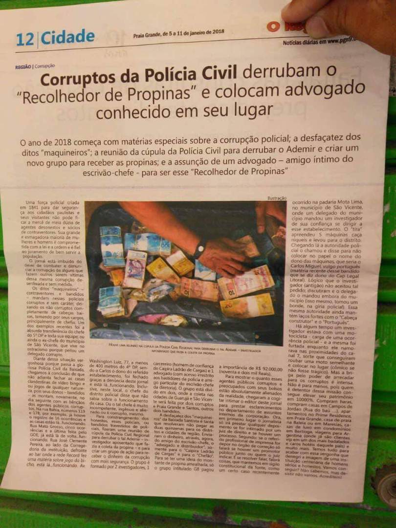 Essa PC da Baixada é um antro de corrupto, ninguém se salva de delegado ao faxineiro. O chefe da seccional foi excluído por ordem do diretor por conta de brigas com outros chefes e principalmente o chefe da DIG que apreendia as maquinas dos amigos da chefia mas nunca aprrendeu uma máquina do tal araponga, maquineiro que dizem ser seu padrinho desde a delegacia do Guaruja. No meu distrito perdemos as ultimas quinzenas como disse o jornalista. Eles lá no palácio recebem e nós não. Quero o meu.