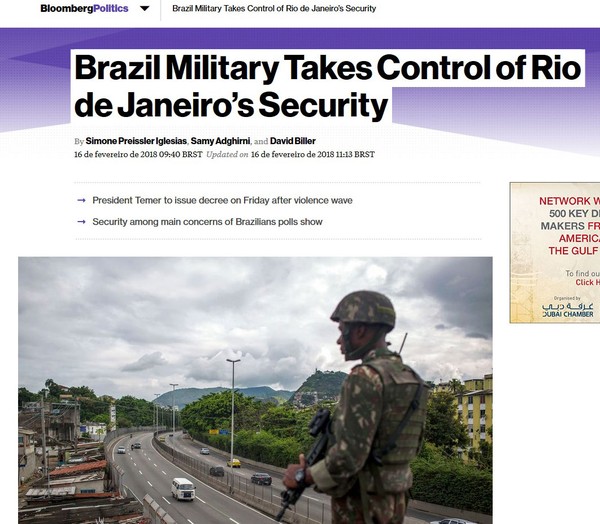 Reportagem da agência Bloomberg sobre a intervenção na segurança pública do Rio de Janeiro (Foto: Reprodução)