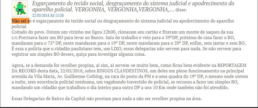 Agora, se a demanda for recolher propina, ai sim, ai servem-se muito bem, como ficou bem evidente na REPORTAGEM DA RECORD desta data, 22/03/2018, sobre BINGOS CLANDESTINOS, um deles em pleno funcionamento na principal avenida da Vila Maria, Av. Guilherme Cothing, na cara do posto da PM e a uma quadra do 19º DP, o mesmo onde ontem a noite, sem ocorrência policial nenhuma, um vagabundo travestido de policial, se recusou a fazer um simples BO, mandando um cidadão que trabalhou o dia inteiro para outro DP a uns 10 Km onde também não foi atendido.