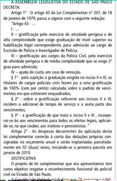 | Ementa | Altera o artigo 43 da Lei Complementar nº 207, de 1979, que dispõe sobre as vantagens de ordem pecuniária dos Policiais Civis. |