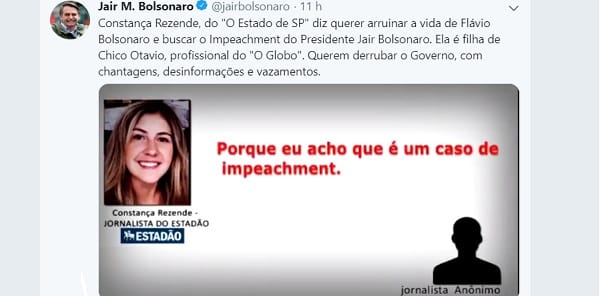 No post, Bolsonaro escreve que Constança Rezende é filha do também jornalista do jornal O Globo Chico Otávio. E diz que “querem derrubar o Governo, com chantagens, desinformações e vazamentos”.