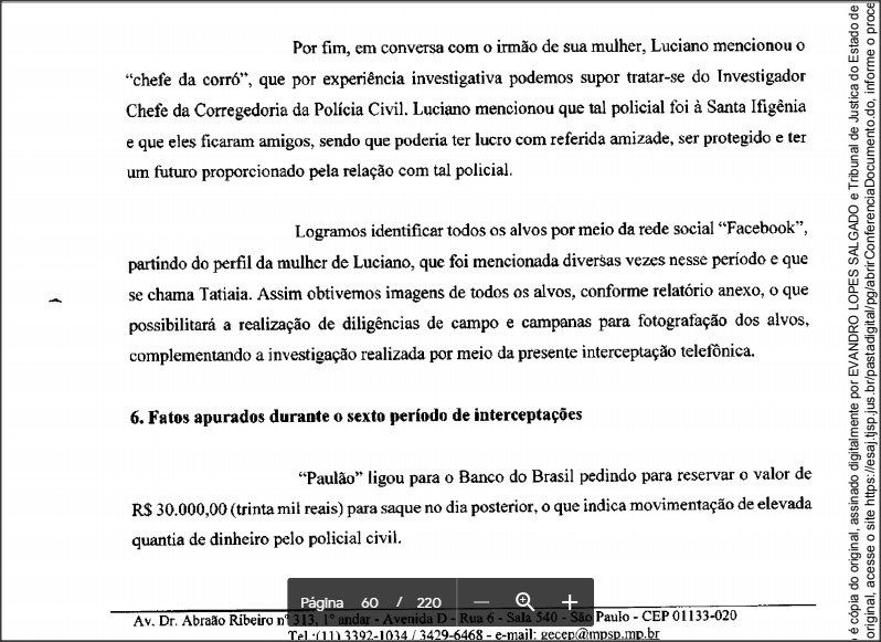 O relatório final do GECEP, com data de 25 de outubro de 2018, traz a seguinte observação: “As interceptações telefônicas realizadas possibilitaram a colheita de indícios robustos de existência da organização criminosa integrada por policiais civis do 3º DP e da 1ª Seccional com vistas à prática de crimes graves em detrimento de comerciantes da rua Santa Ifigênia, como extorsão, prevaricação, entre outros”.