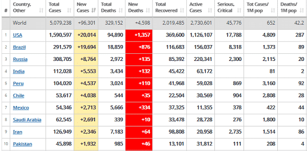O Brasil, hoje, já ameaça roubar dos EUA o apavorante 1° lugar em novos casos registrados de infecção pelo novo coronavirus, mesmo com a crônica escassez de testes: quase 20 mil novos casos, em 24 horas.
