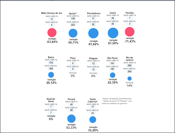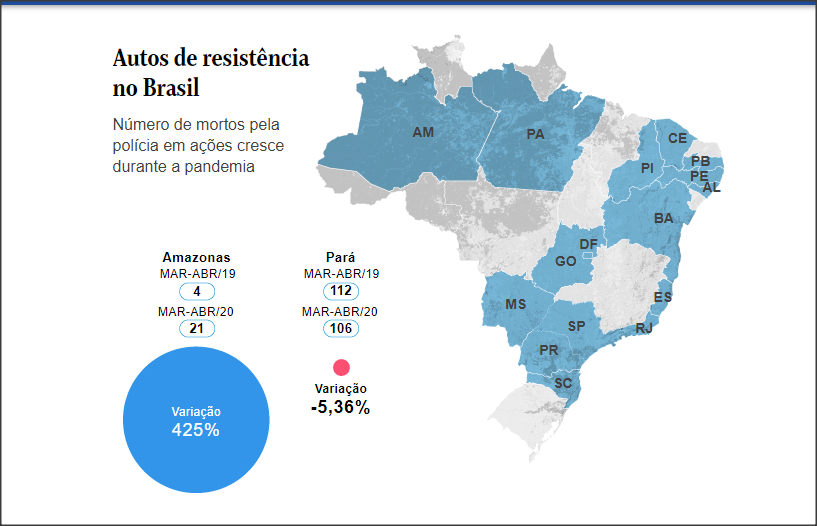 O aumento foi alavancado por abril, que registrou 719 mortes, frente a 477 em 2019 — houve crescimento em dez estados, queda em três, e em dois os números ficaram estáveis. O volume expressivo de mortes por ações da polícia em abril fez com que o primeiro quadrimestre do ano superasse o do ano passado — até março, os dados indicavam uma queda em 2020. Já o volume total de crimes violentos letais intencionais (homicídios, latrocínios e lesões corporais seguidas de morte) cresceu 8% em abril frente ao mesmo período de 2019, segundo o “Monitor da Violência”, do G1.
