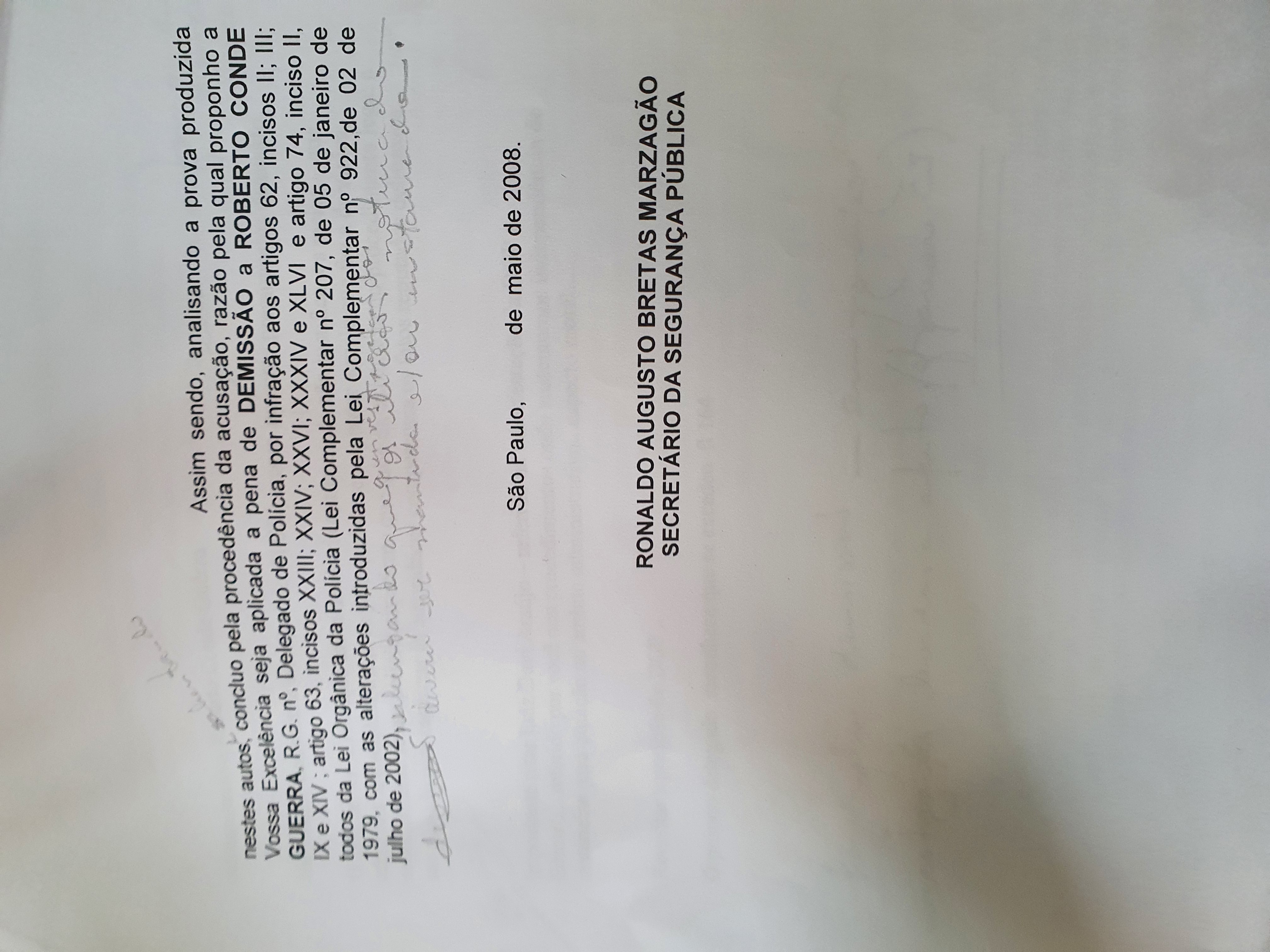 Parecer do Secretário Fernando Grella , não há nenhuma representação ou prova de que essas pessoas se sentiram ofendidas. Apenas a confissão de que o interessado , embora não tenha aderido a greve, durante o movimento recebia e publicava textos de policiais , tomando o cuidado de suprimir o nome dos seus leitores. Represento pela sua absolvição pois em nenhum momento denegriu os serviços da Polícia Civil e a sua conduta não tem relação com os atos do seu cargo e nem o inabilita . Recomendo , contrariando o parecer da Procuradora pela integral absolvição, a penalidade de suspensão por 60 dias , por considerar que lhe caberia suprimir as palavras de baixo calão e os cartuns de péssimo gosto que acompanhavam os escritos. Governador: 60 dias de suspensão. Roberto Conde Guerra abandonou o cargo por ter faltado 282 dias durante o período de dezembro de 2007 a abril de 2009. Conselho a unanimidade: ABSOLVIÇÃO , ele cumpriu integralmente as jornadas de plantão constantes em todas as escalas. Meu ex-amigo Blazeck , abrindo mão de competência privativa, fez os autos conclusos ao seu adjunto: DEMISSÃO! ( O Relator e todos os demais votaram pela inexistência de abandono de cargo ).