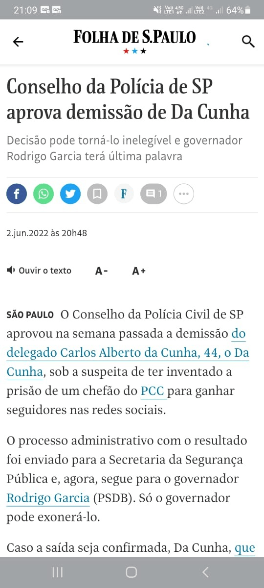 Conheci o Dr. da Cunha, em agosto de 2005…Não sei o motivo: ele veio “se apresentar” ( nunca fui milico ) e conversar comigo! Rapazinho, magrinho , muito educado , falou: sei que o Sr. gosta de estudar, o Dr. Tanganelli me colocou como supervisor do DOP por eu ser R2, mas quero ser Juiz…Eu não fui nada elegante ( fui grosseiro ) , estava em desgraça funcional e com ódio da Polícia Civil , disparei na cara: matou teu sonho…Mas por muito tempo até na biblioteca do Fórum o encontrei, ainda bem magrinho , debruçado em livros; sempre educado , até um certo telefonema, dez anos depois, que me fez de SBC…De qualquer forma, que Deus te livre da demissão e dos esteroides! TEM RACISMO NESSA DEMISSÃO, mas a primeira impressão é a que me vale: em 2005, um bom rapaz e trabalhador até demais ! 11