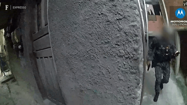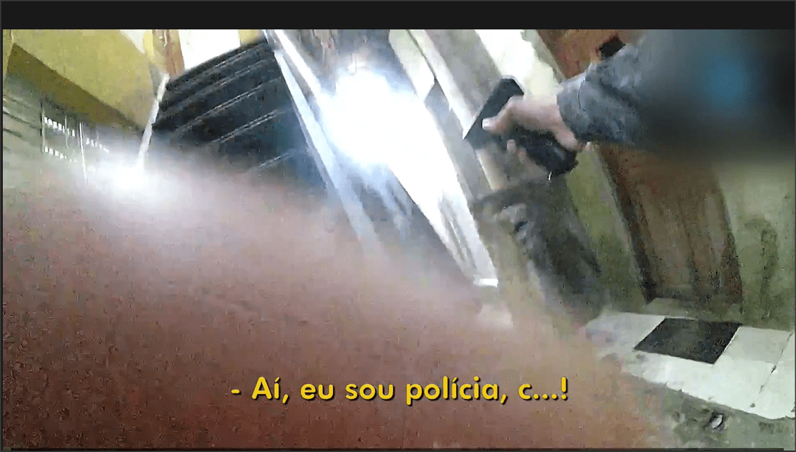 - Bodycam mostra : Após abrir o portão, o campo visual se dirige imediatamente ao corredor estreito. A gravação não indica fuga, corrida ou presença clara de suspeitos à frente — mas pessoas paradas, par a par. O deslocamento é decidido, não reativo.