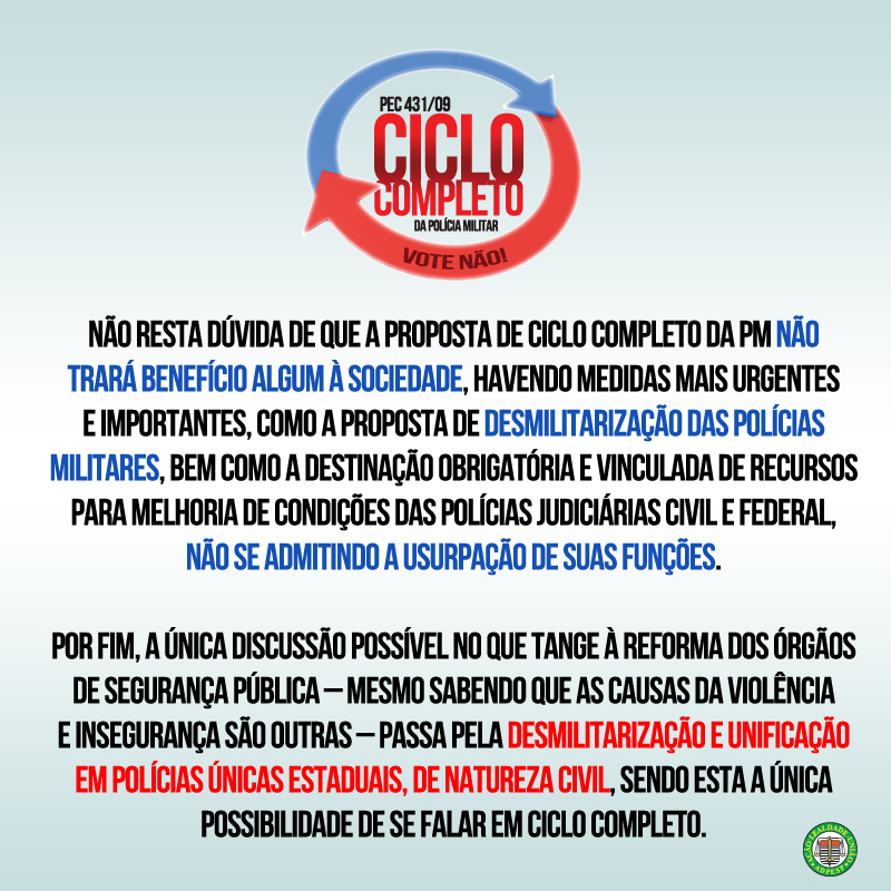 Porque não se discute nem a sombra do projeto a que se destina. Não passa de uma armadilha dos coronéis da PM a fim de dar legitimidade à sua sanha de busca pelo poder absoluto dentro da persecução criminal de polícia. Explico o porquê: A CRIAÇÃO DO CICLO COMPLETO passa obrigatoriamente por uma conscientização do por que as polícias no Brasil, do modo como estão, não funcionam.